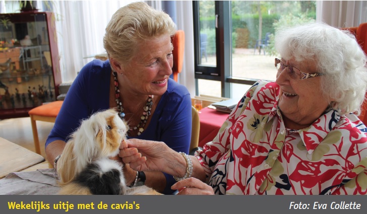 Verder is zij veel te vinden op BuurtBoerderij De Nijkamphoeve. Eerst was de boerderij van de gemeente. Nu is Stichting Vrienden van De Nijkamphoeve de nieuwe beheerder. Marion is een van die beheerders. ‘We hebben vanuit de Boerderij een heel goed contact met de verpleegkundigen en zorgmedewerkers van HWW zorg. Zij komen tussendoor ook met bewoners langs om een kopje thee te drinken. Er is altijd wat te zien; behalve cavia’s zijn er ook ezels, schapen, varkens, geiten, kippen en konijnen. We worden ook gesponsord door Houtwijk. Twaalf jaar geleden kregen we twee ezels van ze.’ Elke dinsdagmiddag kiest zij vier van de acht cavia’s uit die zij meeneemt naar Houtwijk. Dit keer was de dagbehandeling aan de beurt waar ze Dolly, Humpy, Frits en Pluisje mee naar toe nam. Sommige cavia’s hebben mannennamen, maar het zijn bewust allemaal vrouwtjes, want anders zijn er binnen een mum van tijd veel te veel. ‘Per keer ga ik naar een andere afdeling om de cliënten te laten genieten van de cavia’s. Ik laat ze op een tafel lopen en geef ze lekkere hapjes, zoals paprika, witlof of brokjes.’ Een van de cliënten legt haar armen om de beestjes heen. ‘Lekker warm’, zegt ze. Ze straalt als ze naar de diertjes kijkt en praat zachtjes met ze. Marion doet haar voor hoe ze het beestje onder het kinnetje kan aaien. Dat vinden ze lekker. Marion: Als een cliënt niet goed of helemaal niet meer kan zien, pak ik de hand en aai daarmee de cavia’s. Een dier prikkelt meerdere zintuigen zoals zien, horen, ruiken en voelen. Iedereen wordt blij van dieren.’